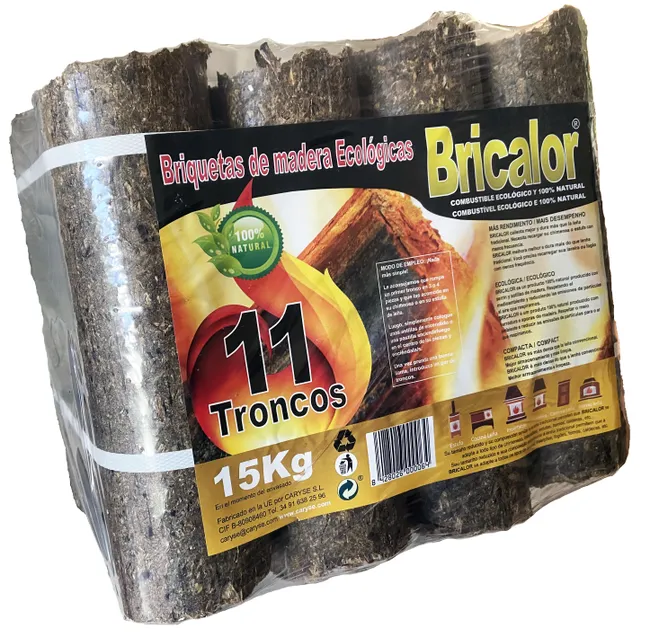 11 briquetas de madera de alto poder calorífico para una óptima combustión, con un peso de 15 kg.